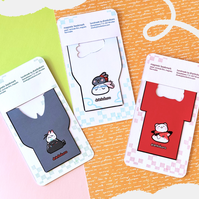 Zakładka ~6 x 10cm po złożeniu. Jednostronnie pokryta matowym laminatem. Od środka zadrukowana wzorem z kluskowatym shipem. Prostokątne magnesy.